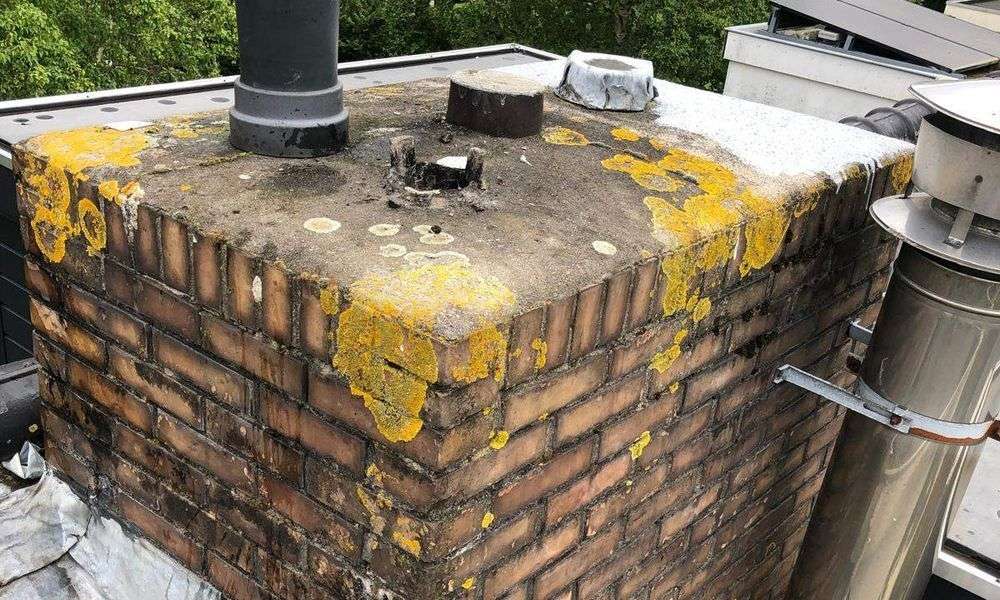 Bovenop de schoorsteen bevindt zich meestal een schoorsteenkap of betonnen afdekplaat. Deze afwerking voorkomt dat regenwater rechtstreeks in de constructie trekt. Zodra de schoorsteenkap beschadigd raakt of scheuren vertoont, kan vocht van bovenaf binnendringen en het metselwerk versneld aantasten.